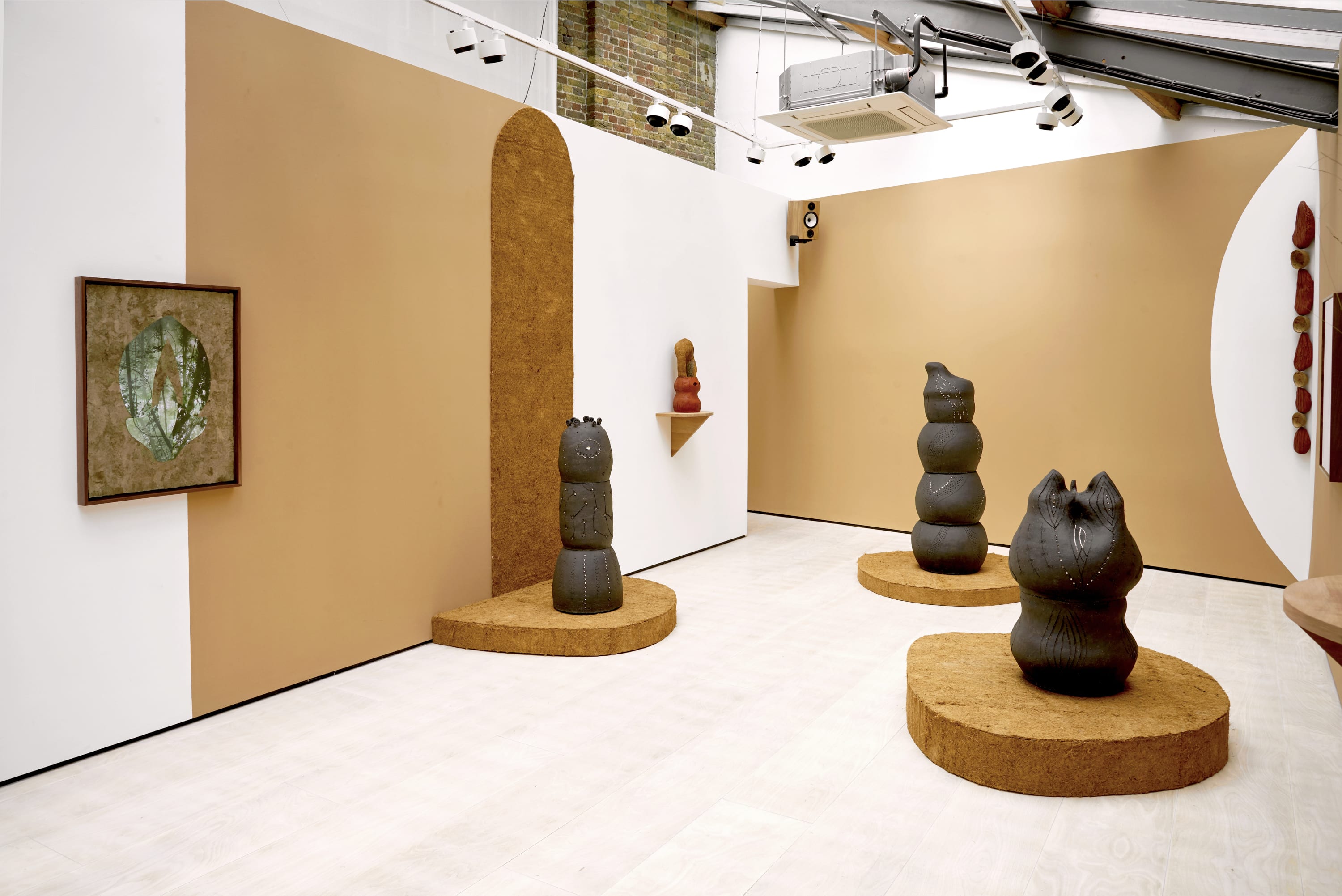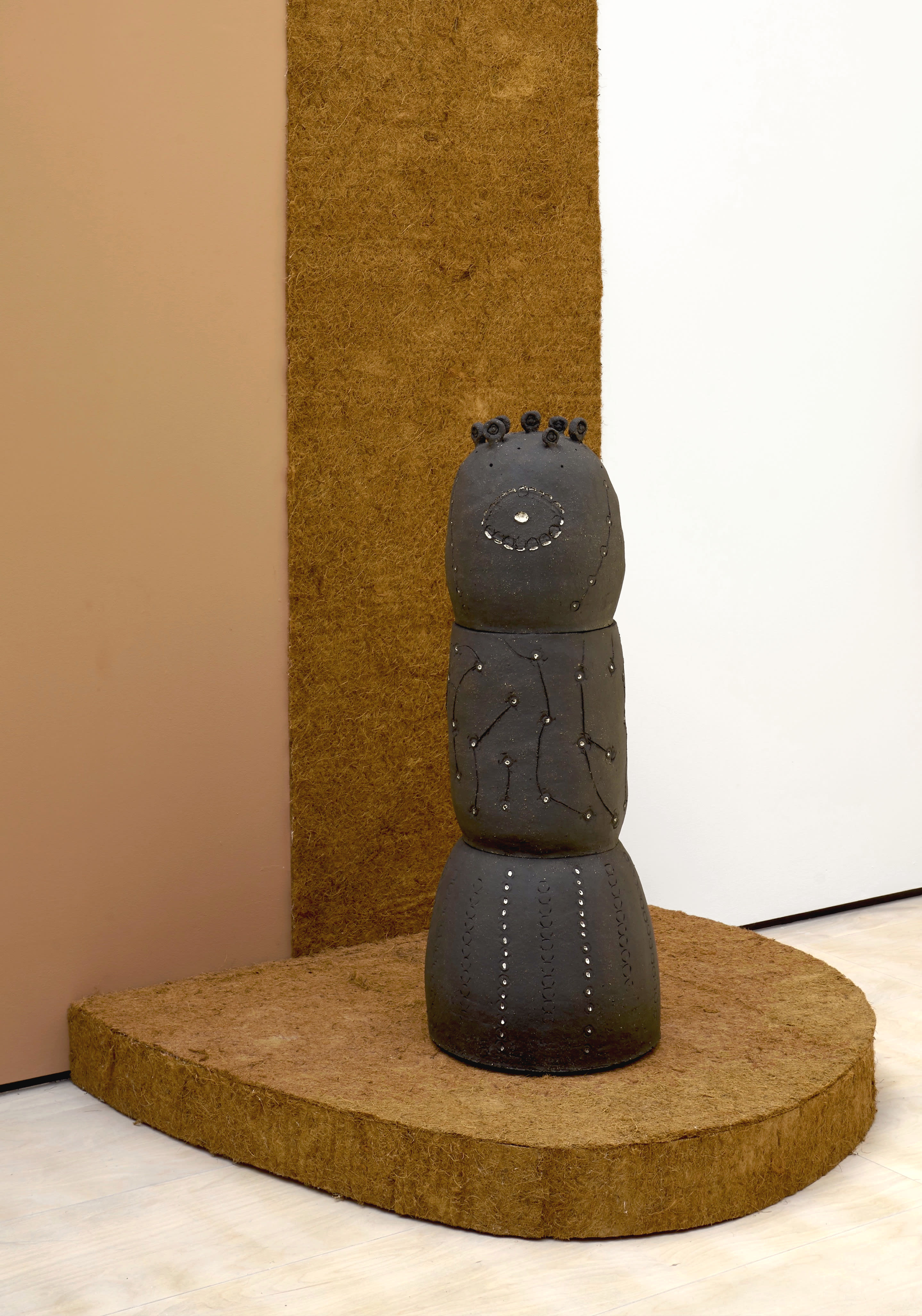 The anthropomorphic, guardian-like sculptures watching over the gallery space reflect Pizzani’s tendency to identify spirit-like imagery within natural forms, exploring concepts of interconnectivity across plant and animal worlds.Many of the sculptures are textured with corn, or incorporate dried, treated corn cobs into their composition (such as Jojoto Rojo, taking its name from the Venezuelan word for corn), as Pizzani celebrates its central importance as a staple food across Latin America. Meanwhile, other works are imprinted with the seeds of plants such as eucalyptus or pine - monocultures now widely cultivated in Latin America which threaten biodiversity. Pizzani’s work speaks to our interdependence with the natural world: the nourishment it provides and the need for us to protect it.