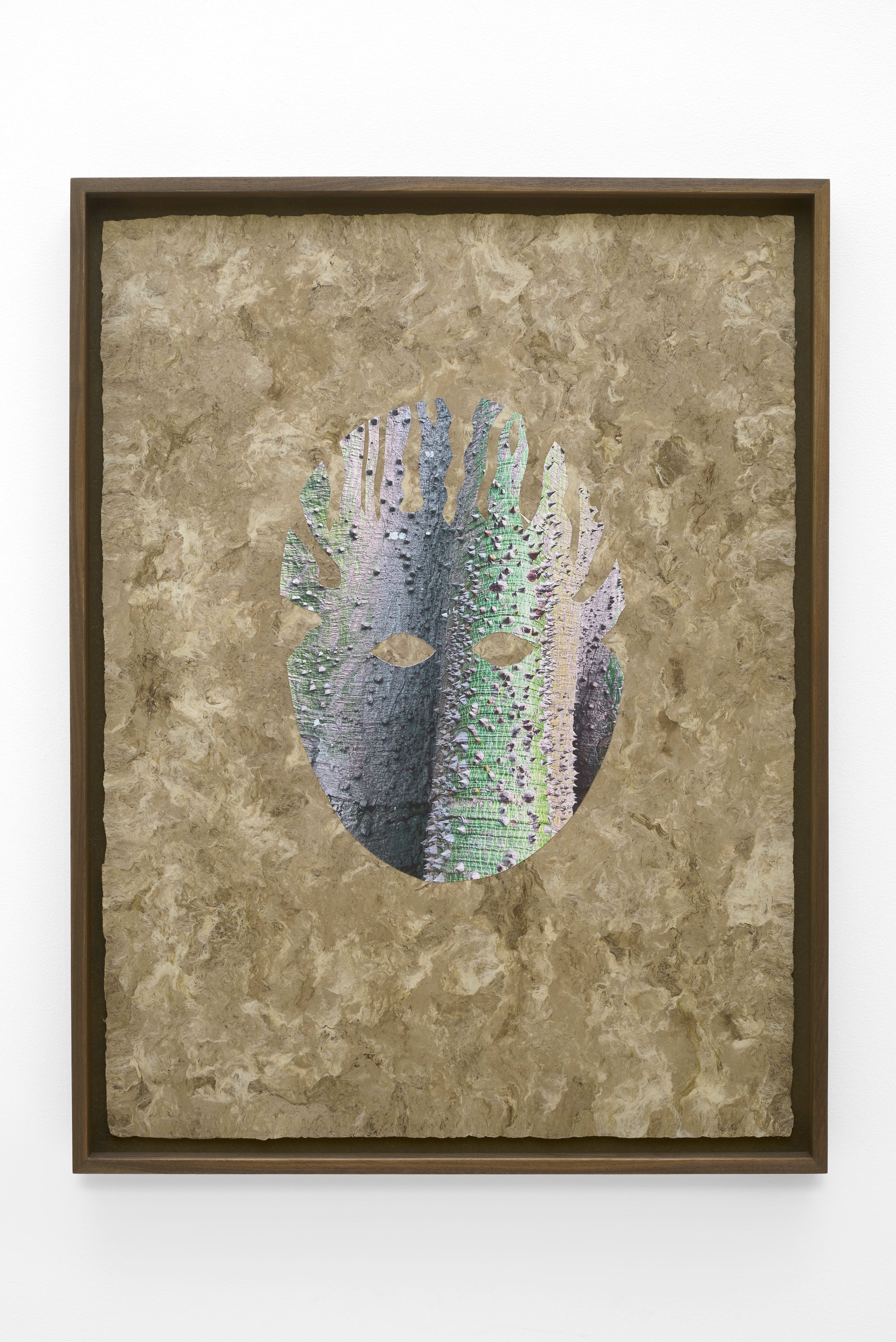 The exhibition includes a series of collages made with Amate paper, made from the woven fibres of tree bark. The oldest existing examples of this material are Mesoamerican codices – manuscripts containing chronicles, rituals and astrological recordings of these civilisations – while most artefacts were destroyed and the production of Amate paper banned by Spanish conquistadors.Now a significant cultural export representing the continuation of Indigenous cultures in Mexico, the material stands for the loss, endurance and transmutation of native cultures and the plant species intrinsic to them, and integral in reciting and sustaining their histories.